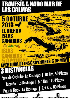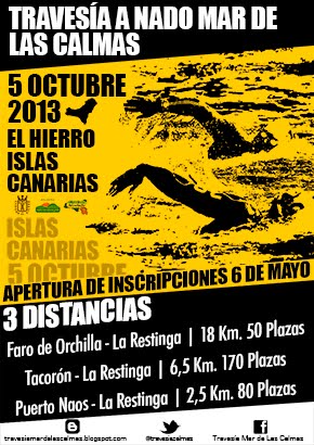 Abierto, desde el 6 de Mayo del 2013, a partir de las 19:00 horas, el plazo de inscripción para la 2ª edición de la Travesía a nado en el Mar de las Calmas, en la Isla del Hierro, la cual se celebrará el sábado 5 de Octubre del 2013.